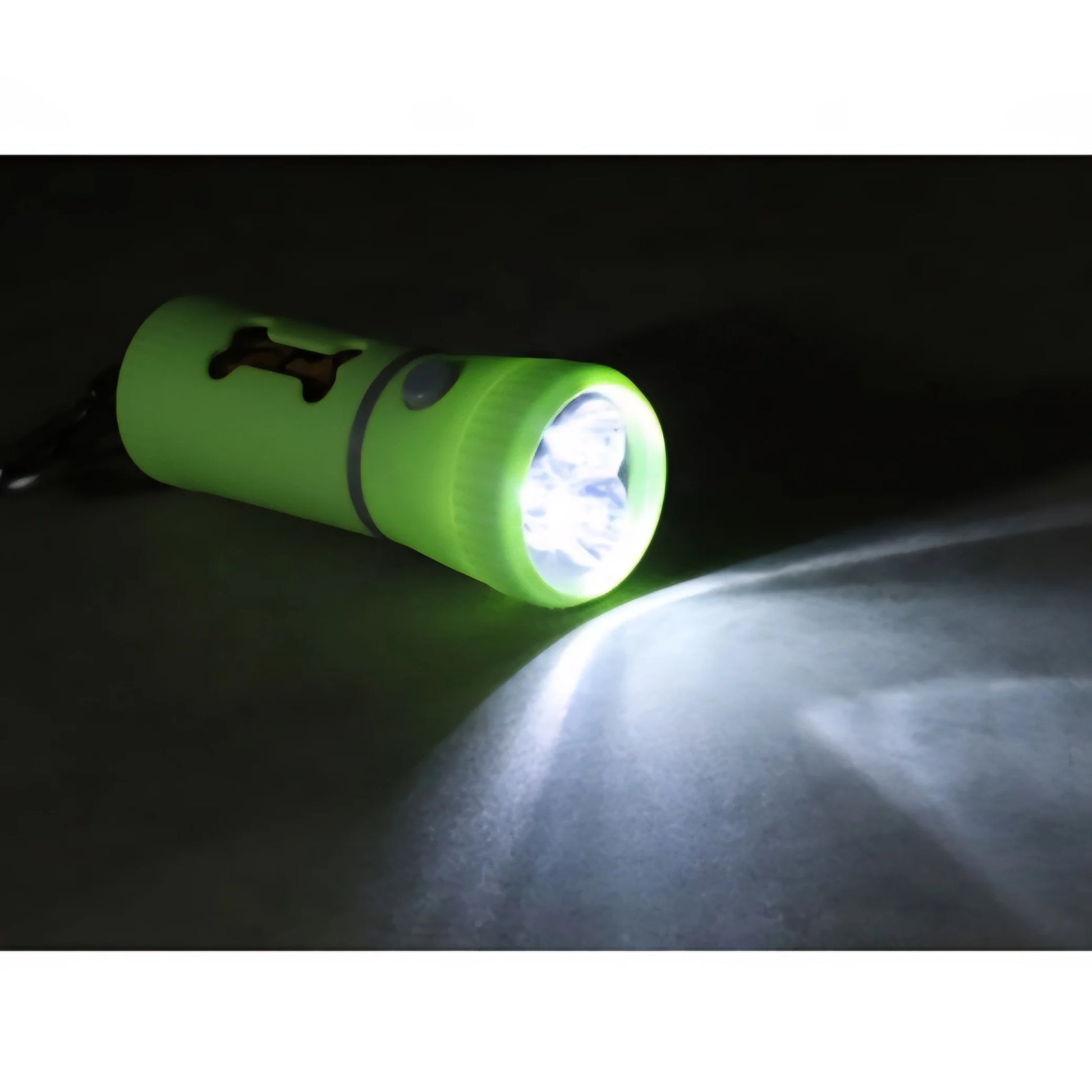 Linterna porta bolsas para heces, se requieren de baterías para su funcionamiento. No incluye baterías. Incluye un rollo de bolsas para heces.