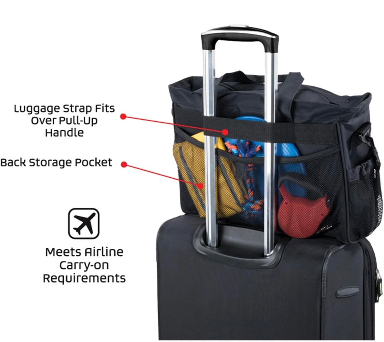 La bolsa tiene compartimento para ponerla en el asa de tu maleta. Es color negro NO INCLUYE NINGÚN ACCESORIO, LA IMAGEN ES ILUSTRATIVA.