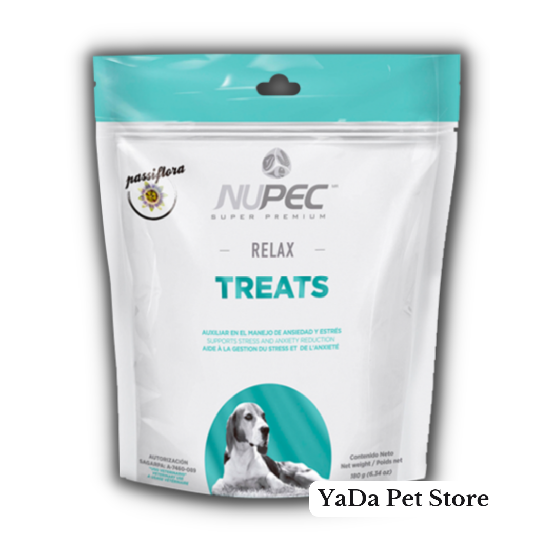 RELAX: Ideal para perritos ansiosos o nerviosos, también puedes utilizarlos para cuando vas a viajar con tu mascota o cuando hay festividades y se utiliza pirotecnia. NUPEC RELAX TREATS ayudan a disminuir el estrés y ansiedad a través de sus ingredientes naturales.