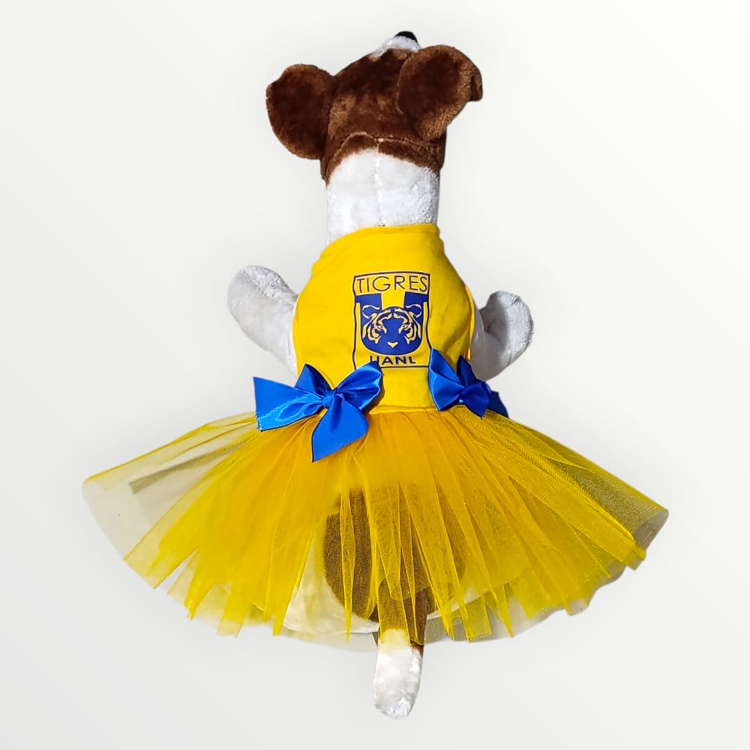 Vestido con tela de algodón y tutú para gatita o perrita. No tiene cierre ni velcro.