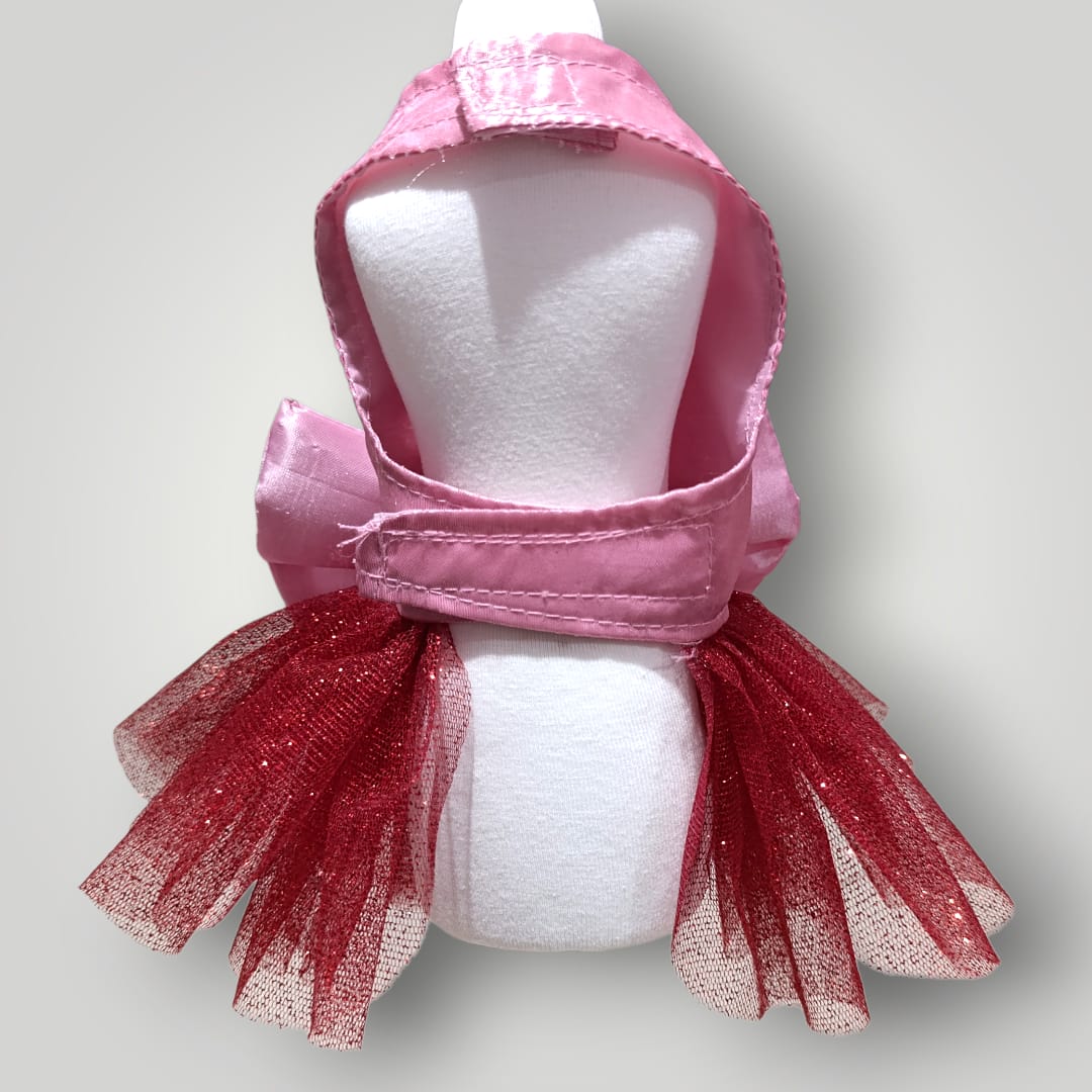 Vestido en rosa pastel con tutu rojo ideal para celebrar a tu gatita o perrita. El cierre es con velcro.